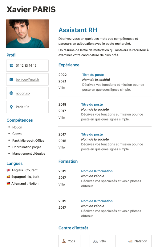 CV simple moderne Notion - Gratuit Français