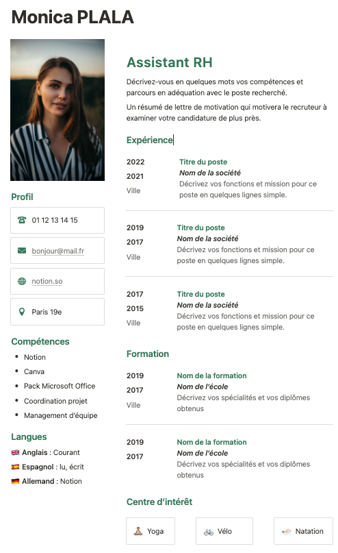 Faire ton CV sur Notion te permet de garder toutes tes informations organisées au même endroit et de les mettre à jour facilement. Tu peux également ajouter des sections personnalisées pour mettre en avant tes compétences et expériences pertinentes.