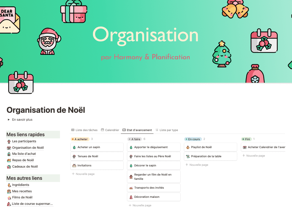 • Organisation de Noël : Planifiez chaque détail, des décorations aux activités, et suivez leur avancement.